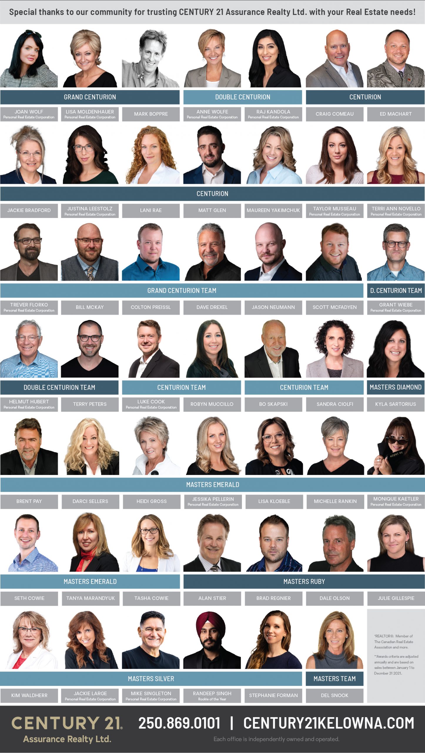 *CENTURION Award* is given to the top 6% of agents across Canada. 29 agents or 36% of Century 21 Assurance Realty Ltd. agents achieved this mark in 2021.