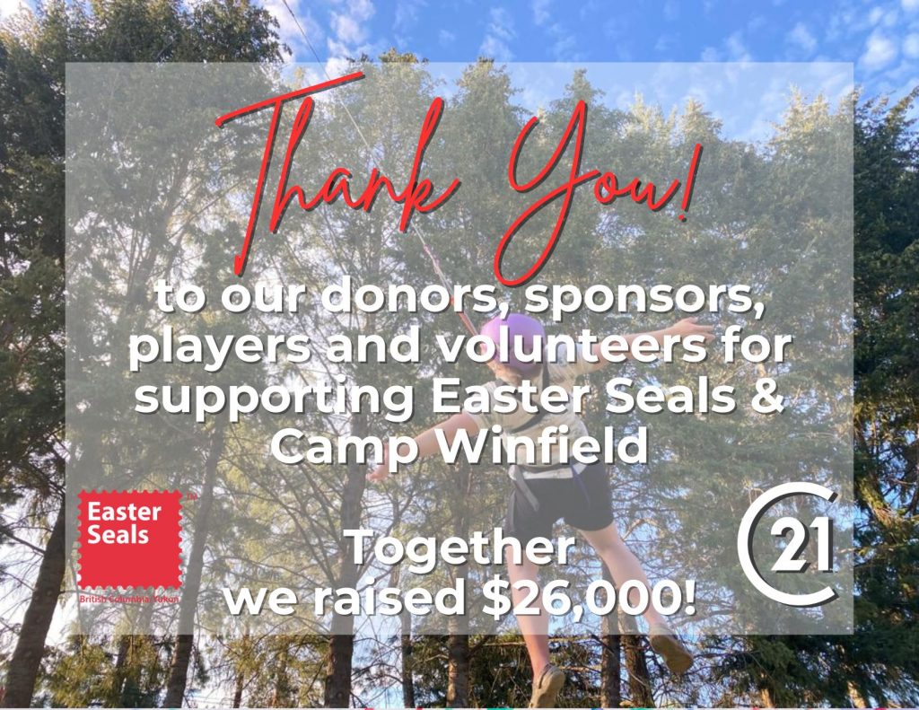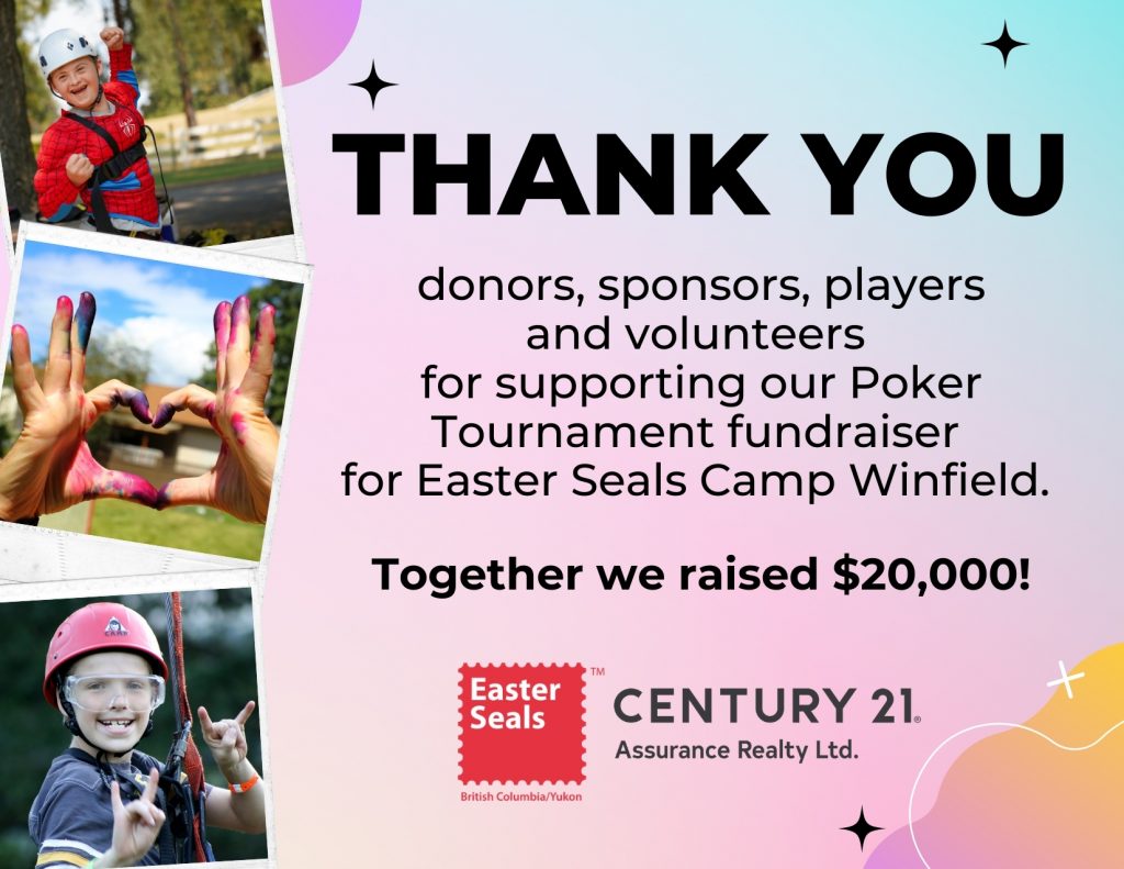 Century 21 Assurance Realty Ltd. is proud to have raised $30,000 for Easter Seals BC/Yukon during our 9th Annual 'Texas Hold 'Em' Poker Tournament.  Funds generated help support families with kids with disabilities and send kids to camp Winfield right here in the Okanagan.
